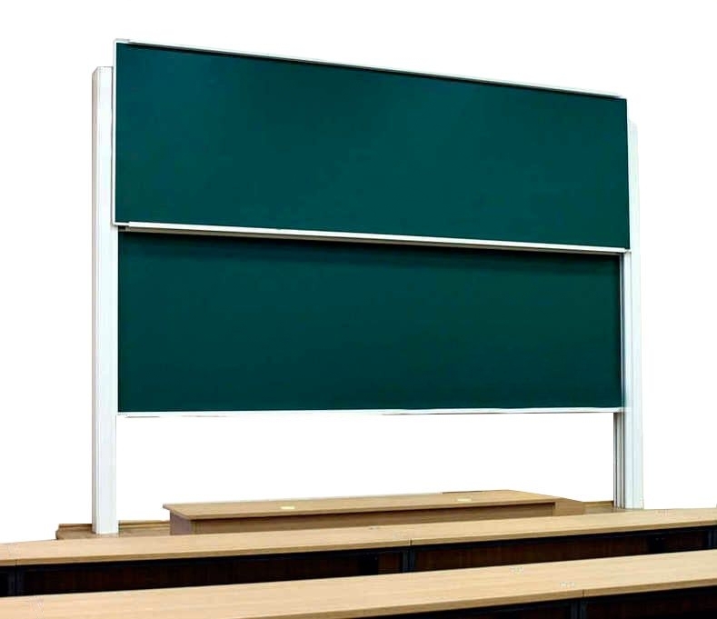 Поверхность для записей мелом представлена в составе колонной системы. Несколько досок сдвигаются по вертикали вне зависимости друг от друга. Такая конструкция гарантирует зрительный комфорт во время занятий. Рабочее поле объемное, подстраивается под актуальную высоту. Надписи на тонкой рельефной поверхности получаются разборчивыми.