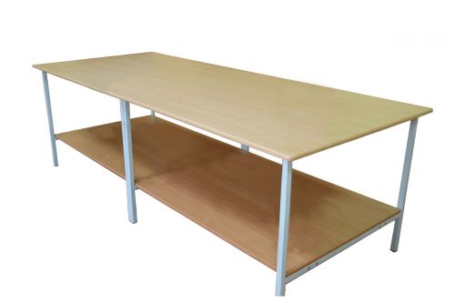 Стол используется во время создания чертежей, раскроя одежды. Конструкция с двумя плоскими поверхностями (для работы и хранения предметов) укреплена парами перемычек. Опоры металлические. Каркас выполнен из профильных труб сечением 25х25 мм. Столешницы располагаются в 2 яруса.