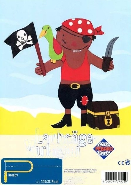Фанерная заготовка для выпиливания лобзиком представляет собой лист высококачественного и экологически чистого материала с нанесенным изображением смешных сказочных персонажей — пирата с флагом и сундуком и попугая. Это хороший шаблон для тренировки навыка работы с инструментом.