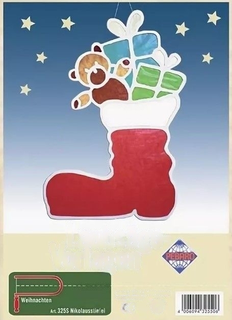 Заготовка представлена фанерным листом формата А4 с рисунком. Следуя лобзиком по нанесенным на заготовку контурам, ребенок обучится художественному выпиливанию и создаст поделку в форме рождественского сапожка с подарками.