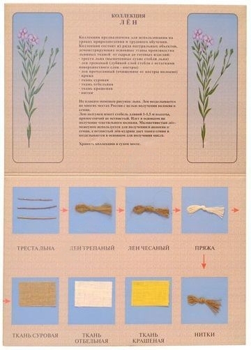На папке представлена схема производства льняных тканей и показаны основные натуральные продукты, получаемые в ходе технологического процесса от исходного сырья до готовой ткани.