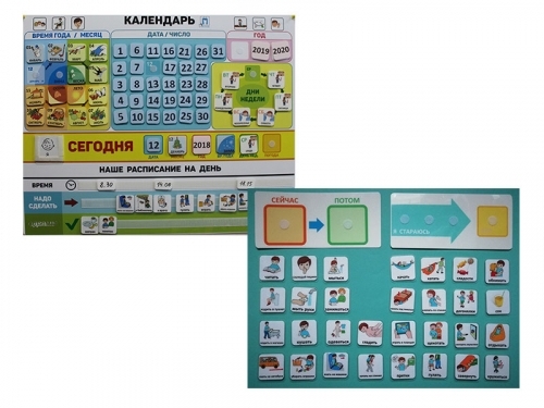 - набор для знакомства с понятиями "Сейчас/потом": 2-хсторонний планшет (ДхШ 900х200 мм, с поощрительным листом), 3 жетона и 30 карточек 4х4 см в конверте.