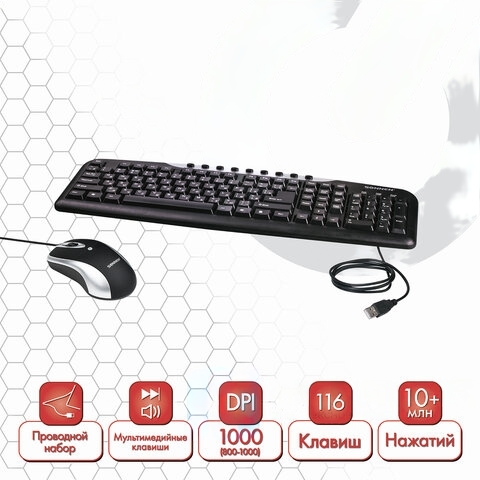 Набор проводной SONNEN KB-S110, USB, клавиатура 116 клавиш, мышь 3 кнопки, 1000 dpi, черный/серебристый, 511284