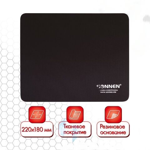 Коврик для мыши SONNEN "BLACK", резина + ткань, 220х180х3 мм, 513309