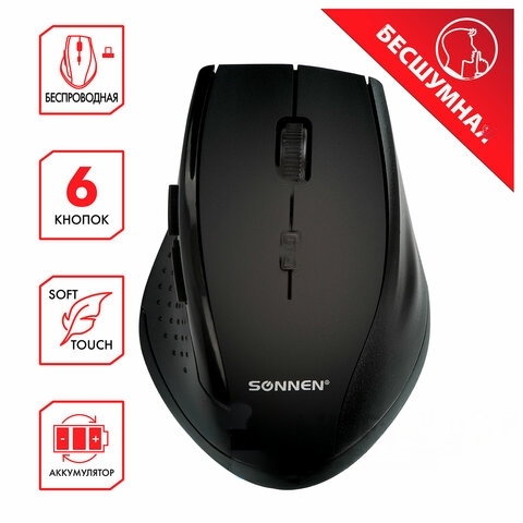 Мышь беспроводная БЕСШУМНАЯ С АККУМУЛЯТОРОМ SONNEN WM-2241, 5 кнопок+1 колесо-кнопка, черная, 513053