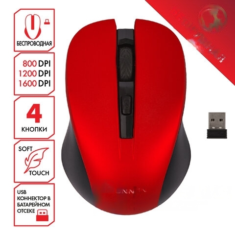 Мышь беспроводная с бесшумным кликом SONNEN V18, USB, 800/1200/1600 dpi, 4 кнопки, красная, 513516