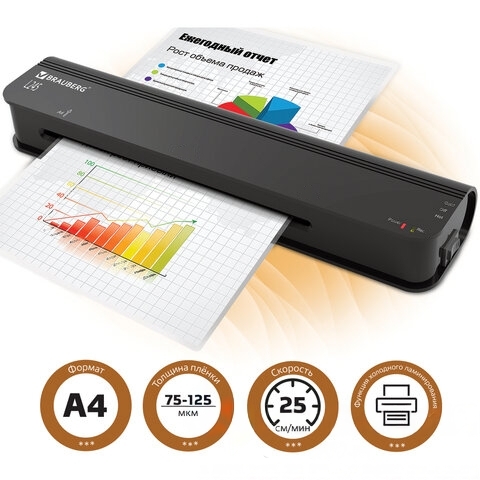 Ламинатор BRAUBERG NANO L245, формат А4, толщина пленки 1 сторона 75-125 мкм, скорость 25 см/мин, 531771