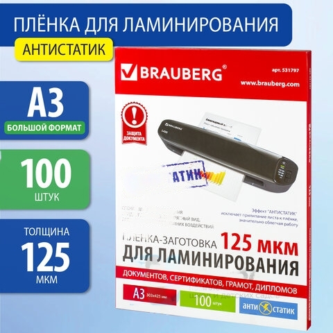 Пленки-заготовки для ламинирования АНТИСТАТИК БОЛЬШОГО ФОРМАТА А3, КОМПЛЕКТ 100 шт., 125 мкм, BRAUBERG, 531797
