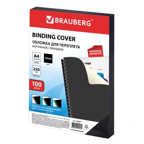 Обложки картонные для переплета, А4, КОМПЛЕКТ 100 шт., глянцевые, 250 г/м2, черные, BRAUBERG, 530841