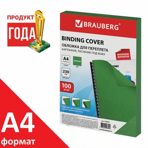 Обложки картонные для переплета, А4, КОМПЛЕКТ 100 шт., тиснение под кожу, 230 г/м2, зеленые, BRAUBERG, 530949