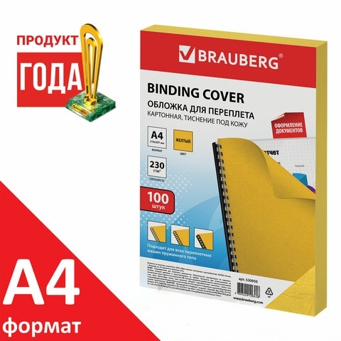 Обложки картонные для переплета, А4, КОМПЛЕКТ 100 шт., тиснение под кожу, 230 г/м2, желтые, BRAUBERG, 530950