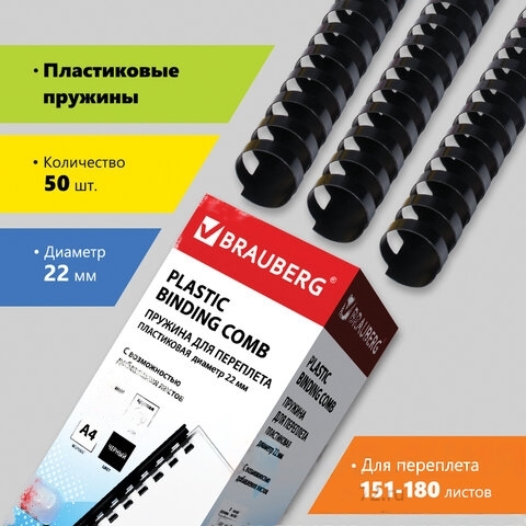 Пружины пластиковые для переплета, КОМПЛЕКТ 50 шт., 22 мм (для сшивания 151-180 л.), черные, BRAUBERG, 530926