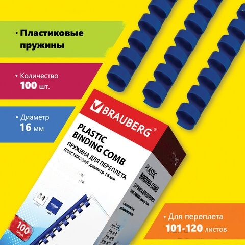 Пружины пластиковые для переплета, КОМПЛЕКТ 100 шт., 16 мм (для сшивания 101-120 л.), синие, BRAUBERG, 530922