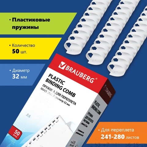 Пружины пластиковые для переплета, КОМПЛЕКТ 50 шт., 32 мм (для сшивания 241-280 л.), белые, BRAUBERG, 530931