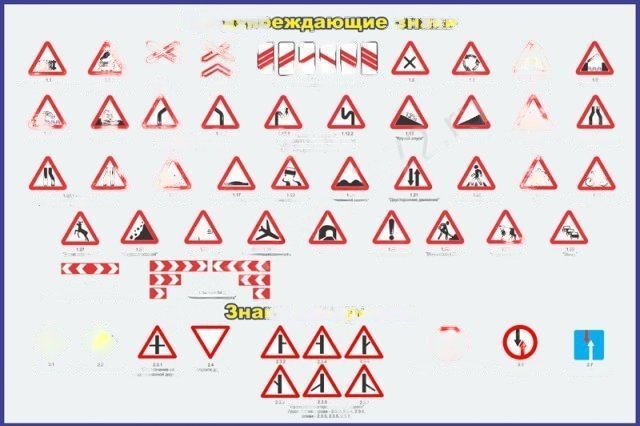 На стенде представлены предупреждающие дорожные знаки, а также знаки приоритета. Предназначен для наглядного объяснения функций различных знаков.
