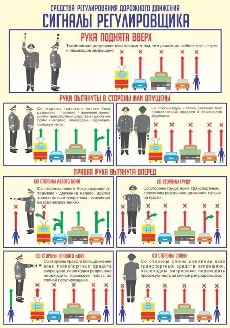 На данном стенде представлены значения различных сигналов регулировщика и соответствующие иллюстрации. Информация будет полезна для всех участников дорожного движения.