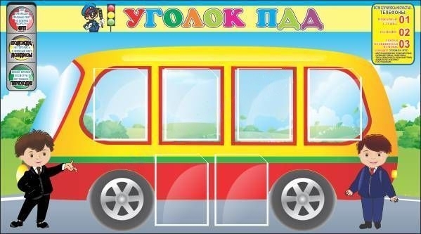 Поможет научить детей правильному поведению на дорогах с раннего возраста. В правом верхнем углу стенда изображен светофор с пояснениями значения каждого сигнала, в левом указаны номера телефонов экстренных служб. В специальных карманах формата А4 можно разместить различные картинки, плакаты, инструктажи и другие информационные плакаты на заданную тему.