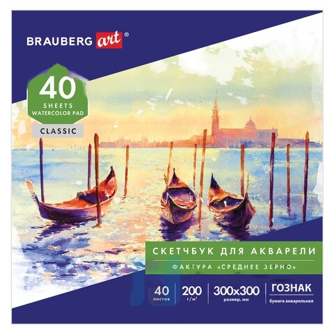 Альбом для акварели, бумага ГОЗНАК СПб 200 г/м2, 300x300 мм, 40 л., склейка, BRAUBERG ART, 106143