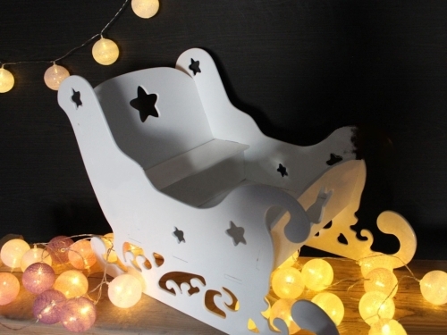 Разборная декорация предназначена для оформления сцены к спектаклям и новогодним праздникам, для хранения подарков на утренниках. Выполнена в виде однотонных саней резной формы. Украшена фрезеровкой в виде завитков и звезд. Легко собирается и разбирается.