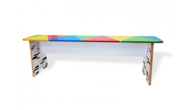 Ножки и сиденье лавки оклеиваются яркой полимерной пленкой. Принт на опорах стилизован под окрас березы. Скамья выдерживает вес взрослого человека, вместе с другими декоративными элементами составляет эффектную композицию для спектакля.