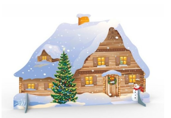 Панель из МДФ с изображением домика со снеговиком и елью имеет закругленные края, фиксируется на подставках.
