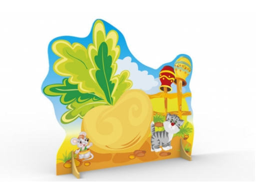 Фигурная панель с плавными краями комплектуется подставками. На рисунке изображается репка, забор с глиняными горшками, кошка и мышь.