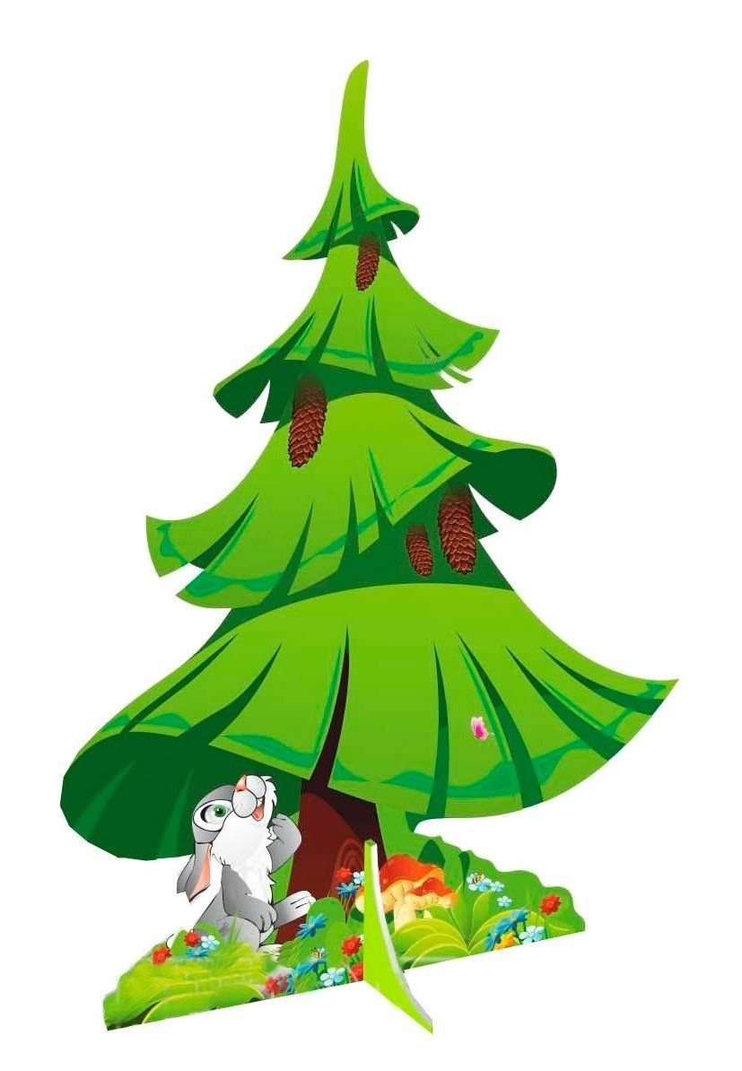 Декоративную конструкцию покрывает яркая полимерная пленка с изображением елки и зайца на холме с цветами. Дизайн изделия подходит для нескольких сказочных сюжетов.