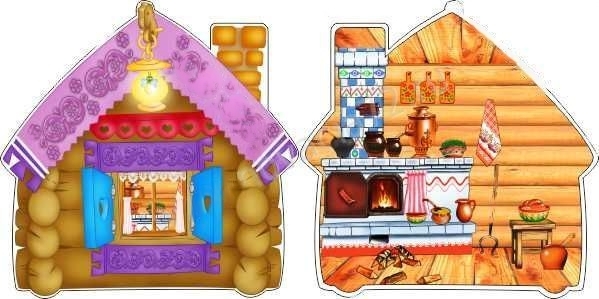Резной напольный двусторонний стенд «Избушка» имеет яркий и красочный дизайн. С одной стороны изображен вид избушки с улицы, с другой стороны показано внутреннее убранство дома. Он может быть задействован в качестве декораций в различных творческих выступлениях и театральных постановках.