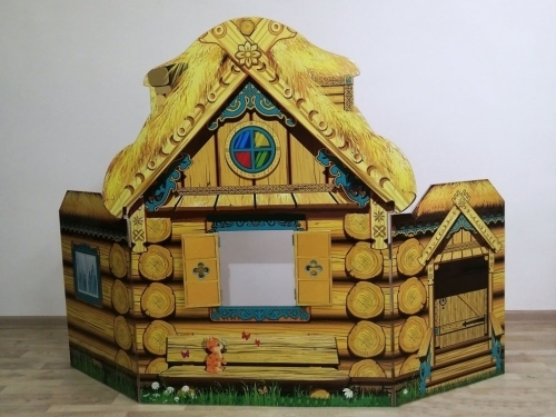 Двусторонняя цветная декорация выполнена в виде избы. На одной стороне размещается изображение фасада избы, на другой - интерьер комнаты. В конструкции есть окно, ставни которого открываются.