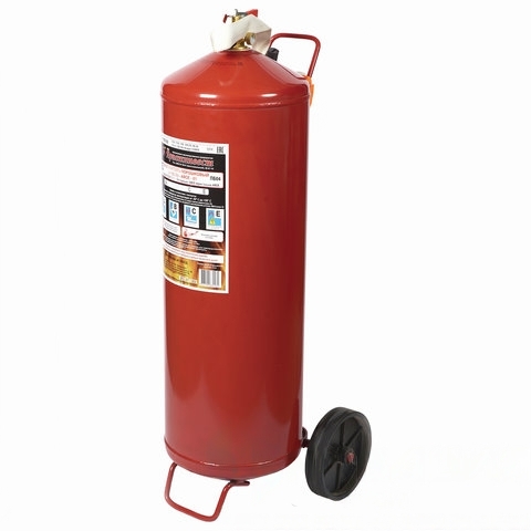 Огнетушитель порошковый, передвижной, закачной ОП-50 состоит из герметичного корпуса, в горловине которого закреплено запорно-пусковое устройство (ЗПУ) (з) с индикатором давления и сифонной трубкой. На ЗПУ закреплена рукоятка, воздействующая при ее повороте на шток и обеспечивающая открытие клапана запорно-пускового устройства. При этом под действием сжатого воздуха газопорошковая смесь выбрасывается на очаг пожара через сифонную трубку, в канал горловины, в гибкий шланг с насадкой на конце в виде расширяющейся струи. Для прекращения истечения порошка рукоятку вернуть в исходное положение. Гибкий шланг крепится через штуцер к ЗПУ. Контроль рабочего давления осуществляется по манометру.