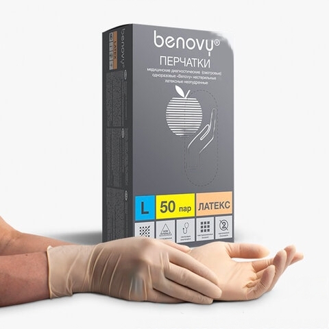 Перчатки латексные смотровые КОМПЛЕКТ 50 пар (100 шт.), размер L (большой), бежевые, BENOVY Latex Chlorinated