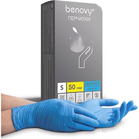 Перчатки нитриловые смотровые КОМПЛЕКТ 50 пар (100 шт.), размер S (малый), голубые, BENOVY Nitrile Chlorinated