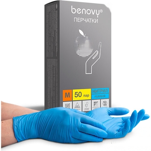 Перчатки нитриловые смотровые КОМПЛЕКТ 50 пар (100 шт.), размер M (средний), голубые, BENOVY Nitrile Chlorinated