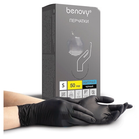 Перчатки нитриловые смотровые КОМПЛЕКТ 50 пар (100 шт.), размер S (малый), черные, BENOVY Nitrile Chlorinated