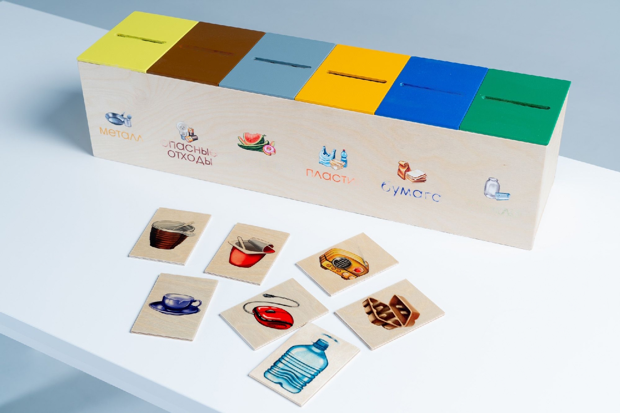 Набор для дидактической игры представлен мини-контейнерами и цветными карточками. На контейнеры нанесены обозначения видов мусора. Карточки с соответствующими картинками распределяются по контейнерам.