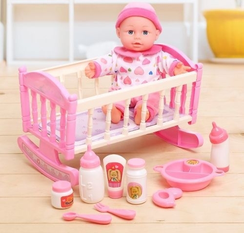 Кукла со звуковыми функциями помогает развивать речь и восприятие на слух, дополнительные предметы (кроватка, посуда, постельное белье, пижамка) помогают продумать действие для сценки.
