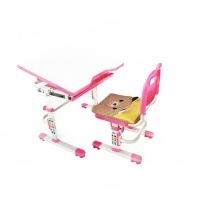 Цвет столешницы и металлокаркаса – белый. Спинка и сиденье стула, кромки и соединительные элементы комплекта оформлены в розовой, голубой или серой гамме.