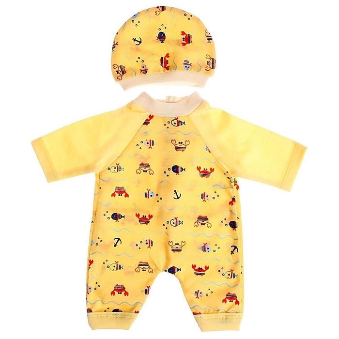 Комплект одежды для кукол (высотой 420 мм) состоит из комбинезона с рукавами и шапочки. Ткань украшена рисунками.