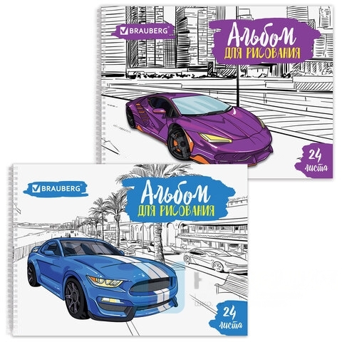Альбом для рисования А4 24 листа, гребень, обложка картон, BRAUBERG, 205х290 мм, "Суперкары" (2 вида), 105061