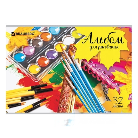 Альбом для рисования А4, 32 листа, скоба, обложка картон, BRAUBERG, 202х285 мм, "Краски" (1 вид), 105063