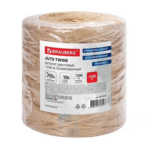 Шпагат джутовый полированный длина 1200 м диаметр 1,8 мм, 2-х ниточный, BRAUBERG, 607942