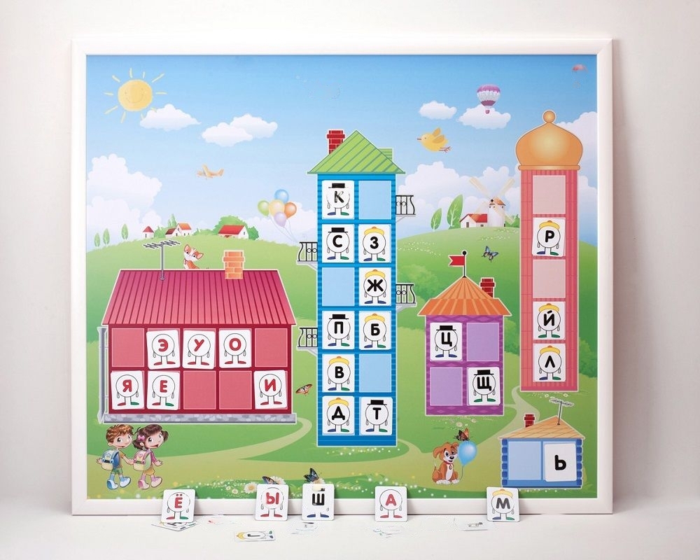 В комплект входят доска и 33 магнитных карточки с буквами русского алфавита. На доске изображены четыре домика с окошками, в которых необходимо правильно расставить карточки с буквами. Занятия с набором не только позволяют изучать алфавит в игровой форме, но и способствуют развитию памяти и внимания.