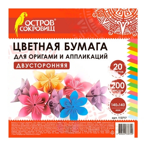 Бумага для оригами и аппликаций 14х14 см, 200 листов, 20 цветов, ОСТРОВ СОКРОВИЩ, 113717