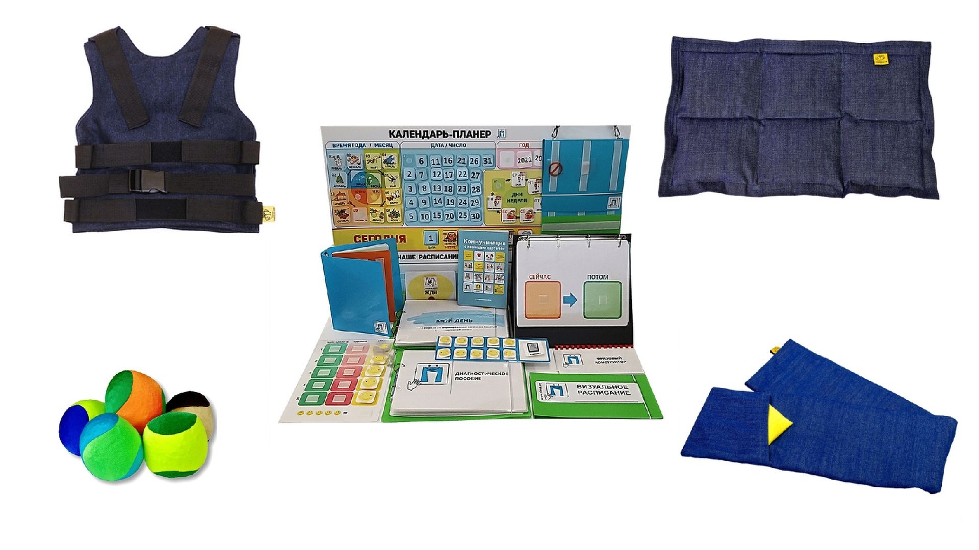 Шарики и утяжеленные изделия (шарф, жилет, подушка) стимулируют сенсорное восприятие, успокаивают нервную систему. При необходимости аксессуары задействуются в играх для развития памяти, коррекционных упражнениях.
