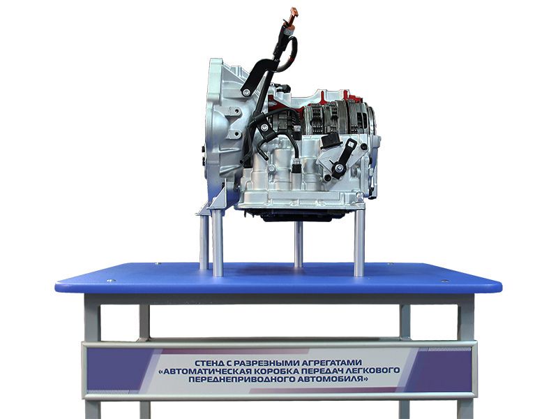 Автоматическая коробка передач на подвижном основании применяется для изучения механизмов легкового автомобиля с передним приводом. Стенд оснащается разрезами гидротрансформатора, корпусных элементов. Основание изготавливается из металла.