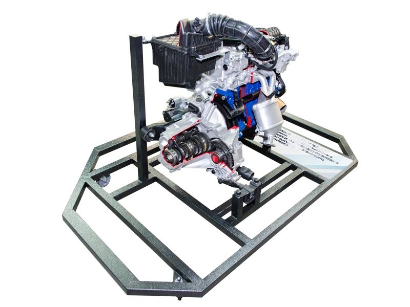 Оборудование служит для изучения принципов действия силовых агрегатов легкового транспорта. Подвижное основание стенда изготавливается из стали. На стенде закрепляется двигатель автомобиля с передним приводом (распределительный вал наверху). Потребляемая мощность составляет не более 2,5 кВт.