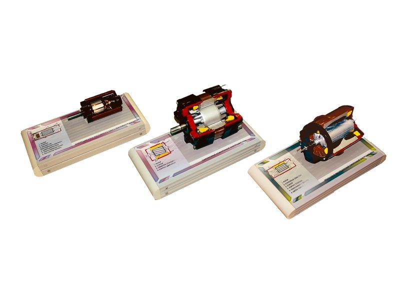 Оборудование представляет собой набор электрических машин постоянного тока в разрезанном виде.