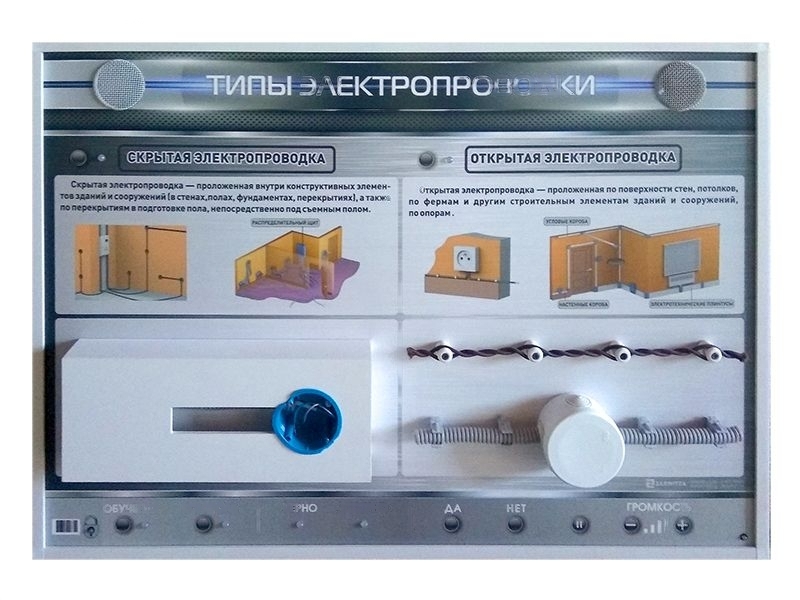 Специальные датчики реагируют на касание рукой. Кроме обучающего режима с последовательным высвечиванием типов проводов предусматривается режим генерации случайного вопроса. Индикаторы показывают, является ли ответ верным. В наличии управляемое голосовое сопровождение.