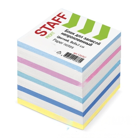Блок для записей STAFF непроклеенный, куб 9х9х9 см, цветной, чередование с белым, 126367