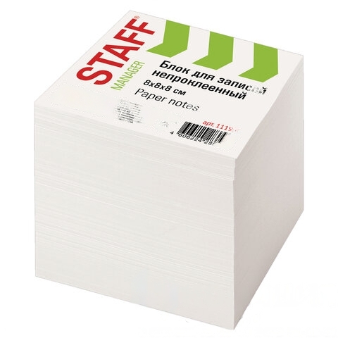 Блок для записей STAFF непроклеенный, куб 8х8х8 см, белый, белизна 90-92%, 111980
